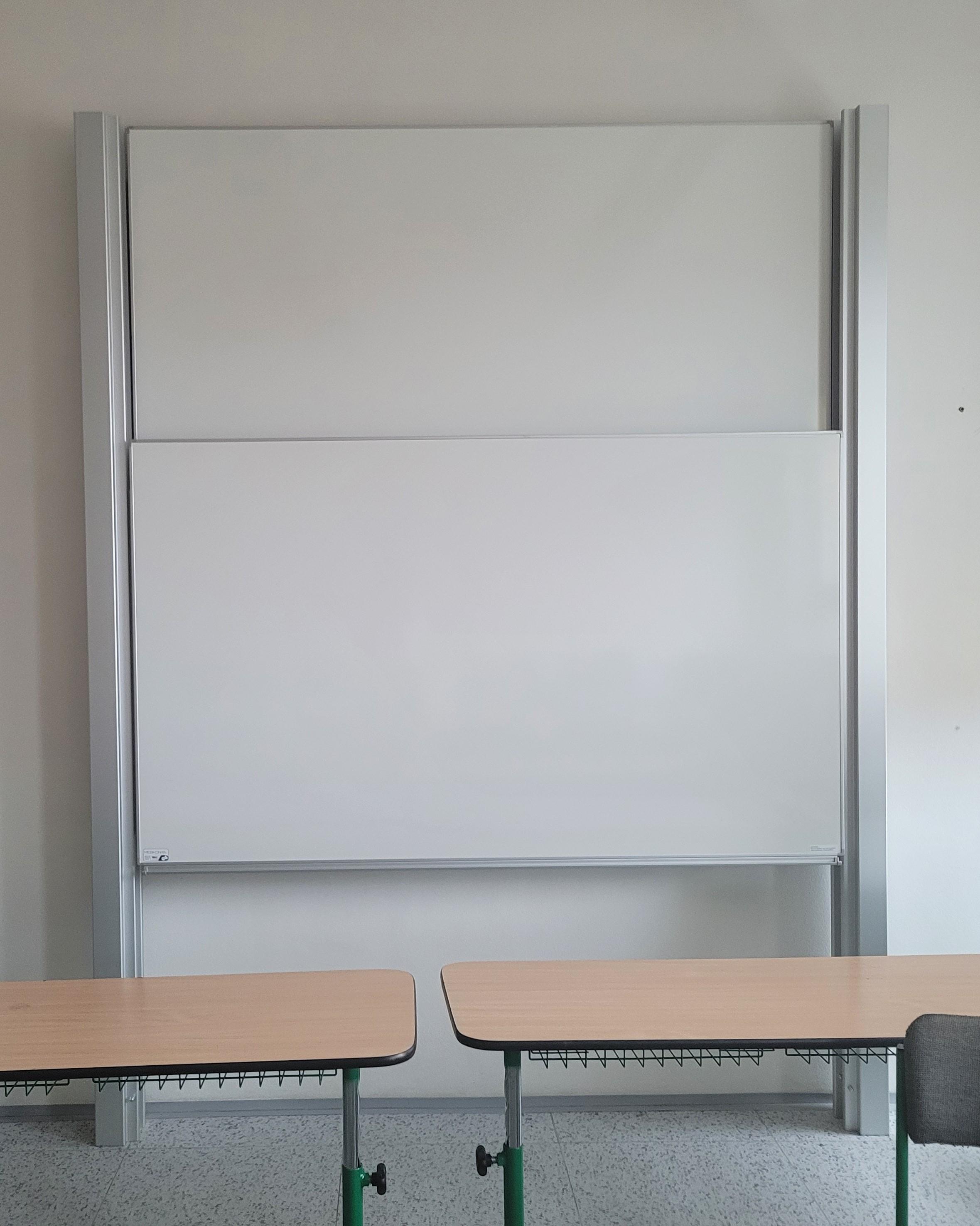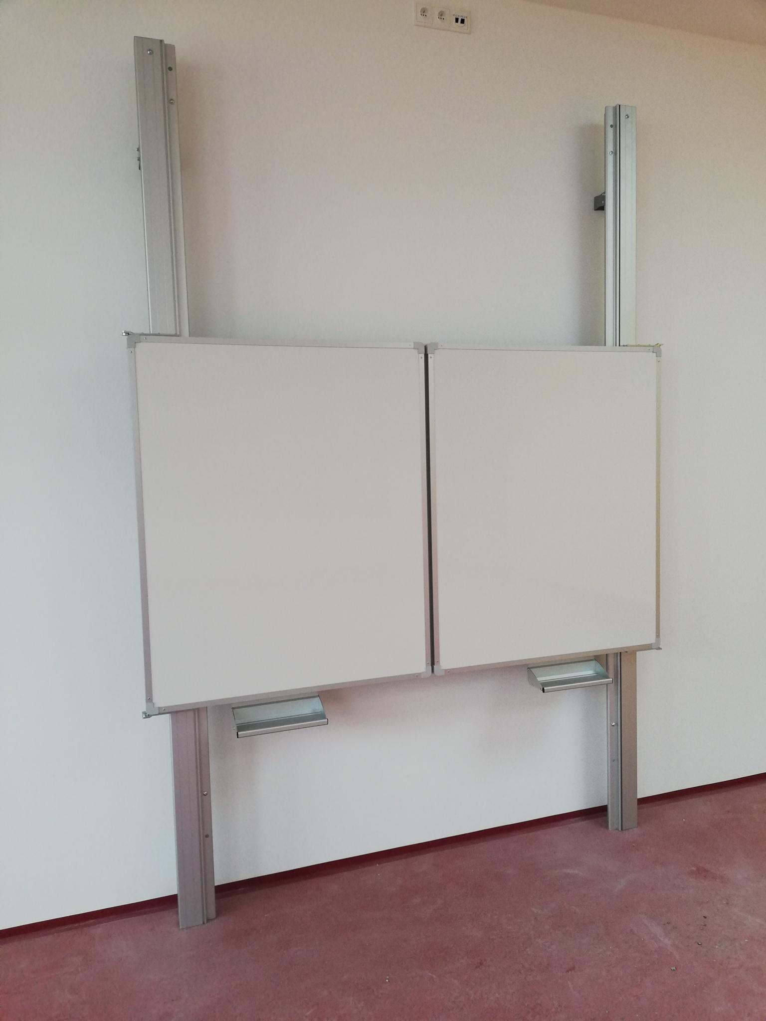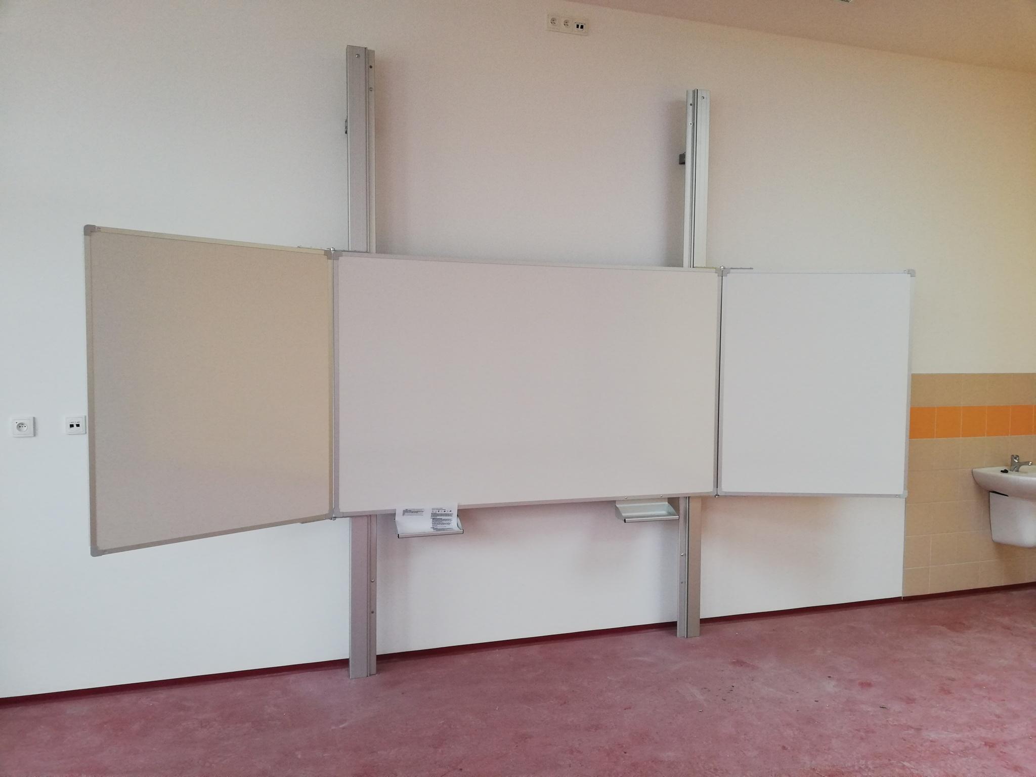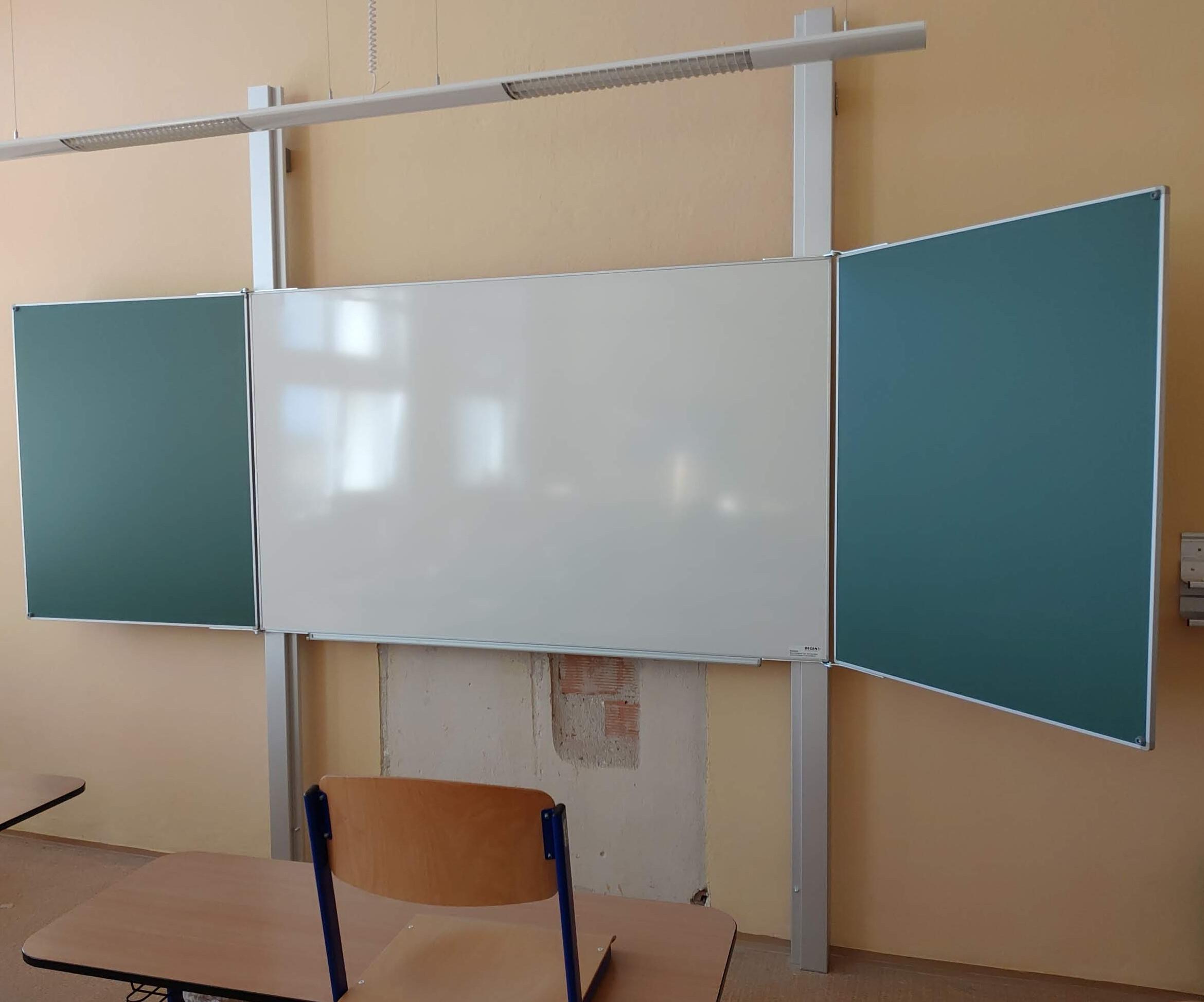 Školní pylonové tabule triptych s magnetickým keramickým povrchem nabízíme se zárukou 25 let. Bezpečné používání pylonové tabule pak zajišťuje speciální zvedací mechanismus umístěný na pylonových pojezdech a závažích.