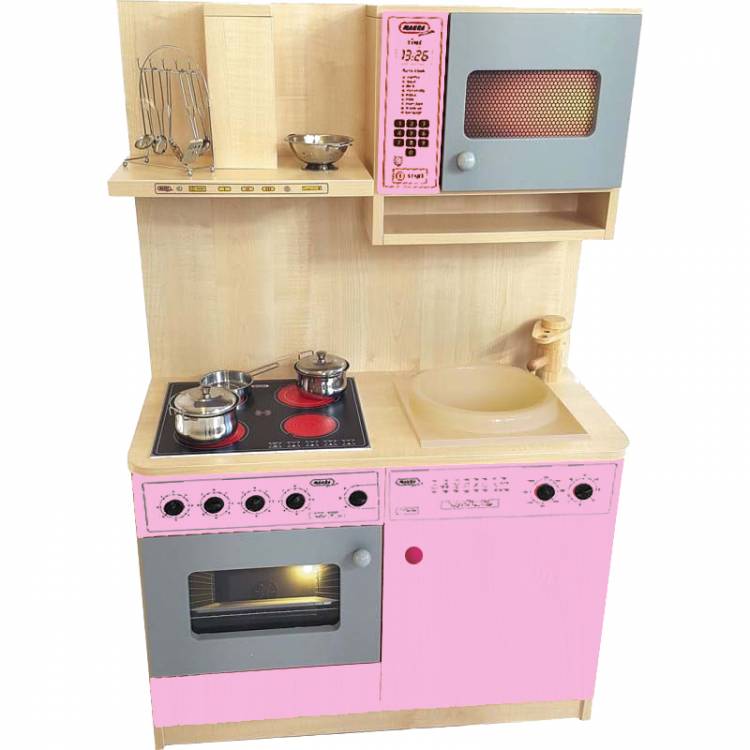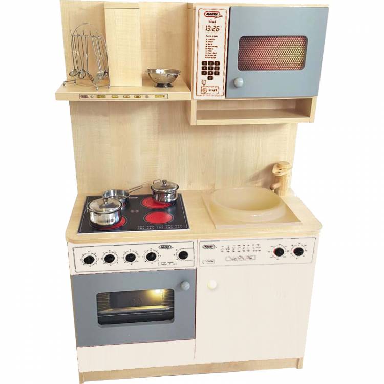 Dětská kuchyňka krátká (š/v/h) 810x1250x380 mm s imitací horkovzdušné trouby, indukční varné desky, digestoře, myčky a mikrovlnné trouby. Výrobek disponuje otočnými ovládacími knoflíky a plastovým dřezem s imitací otočné vodovodní baterie. Vyrobeno klasickou technologií lepených kolíkovaných spojů. Dodáváno na tři části (nutná kompletace). Zvolit lze dvě barvy dekoru v jakýchkoliv kombinacích (korpus, dvířka).