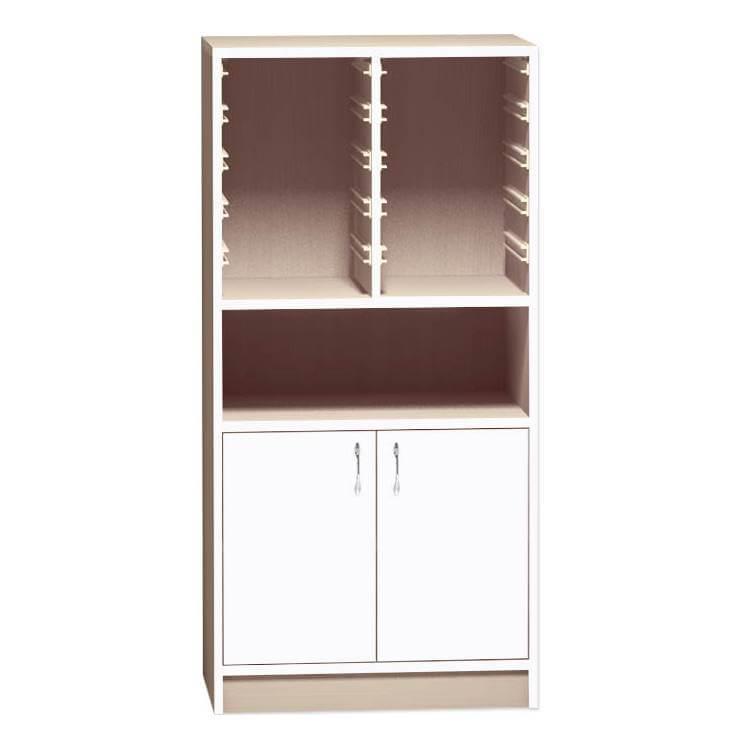 Skříňka na plastové boxy s dvířky (š/v/h) 710x1210x450 mm. Vyrobeno klasickou technologií lepených kolíkovaných spojů. Dodáváno ve zkompletovaném stavu. Zvolit lze dvě barvy dekoru v jakýchkoliv kombinacích (korpus, hrany, dvířka). Skříňky obsahují kolejnice, díky kterým si můžete rozestavení a typ boxů zvolit sami dle schématu u detailu produktu.