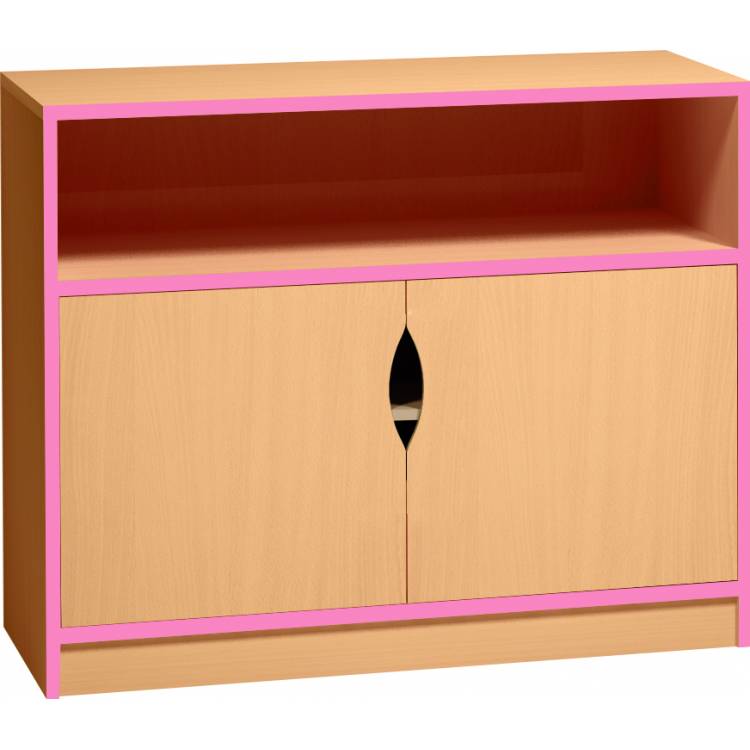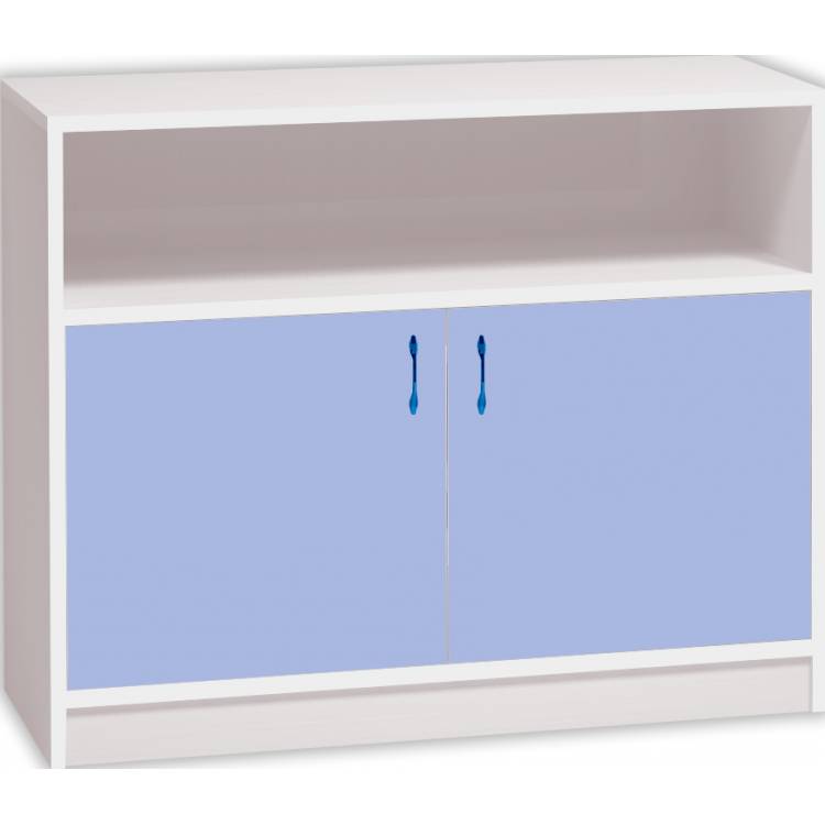 Skříňka s dvířky a otevřenou policí (š/v/h) 1000x760x450 mm. Vyrobeno klasickou technologií lepených kolíkovaných spojů. Dodáváno ve zkompletovaném stavu. Zvolit lze dvě barvy dekoru v jakýchkoliv kombinacích (korpus, hrany, dvířka)